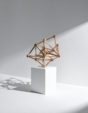 A close-up of a geometric sculpture made from metal, casting interesting shadows against a white background. -