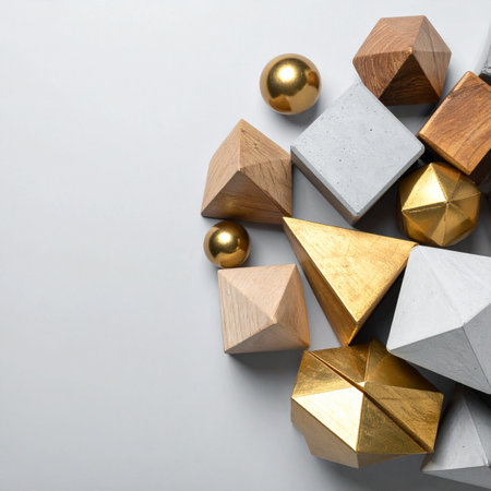 A collection of diverse geometric forms in wood, concrete, and shimmering gold are arranged on a neutral background.