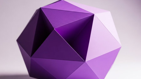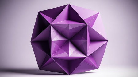 Background showing intricate geometric purple polyhedron with sharp edges and faceted surfaces casting subtle shadows on a light purple background, abstract 3d...