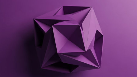 Sculpture showing a complex geometric polyhedron sculpture in a vibrant purple color with sharp edges and intricate facets casting subtle shadows on a solid purple...