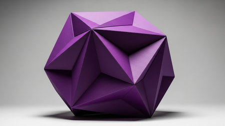 A vibrant purple geometric origami sculpture with sharp, angular facets is centrally placed on a light gray studio background, casting subtle shadows.