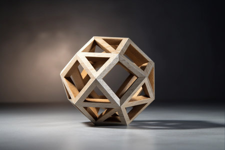 Aesthetic Shadows: Light Wood Icosahedron Casting Reflections on Gray Background