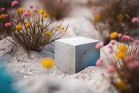 An AI generated illustration of a grey concrete block on a sandy beach surrounded by vibrant flowers