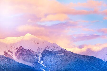 Sunset view of Caucasus mountain peaks and colored clouds during winter with snow caps