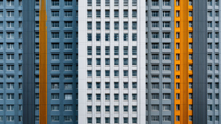 A striking facade of a contemporary apartment building displaying a mix of blue, white, and orange elements under clear skies, showcasing modern architecture.