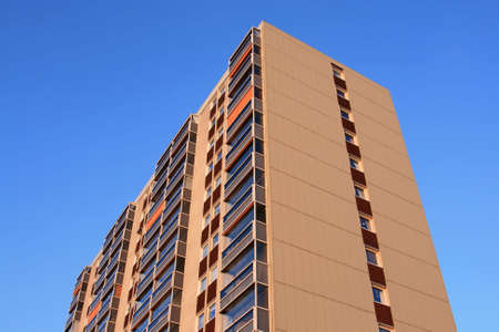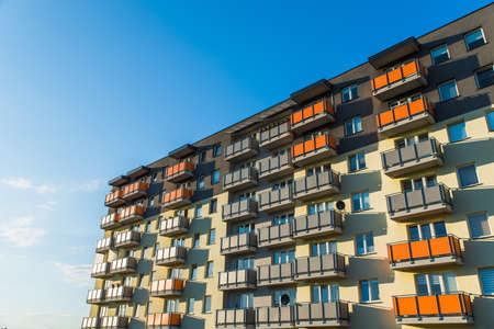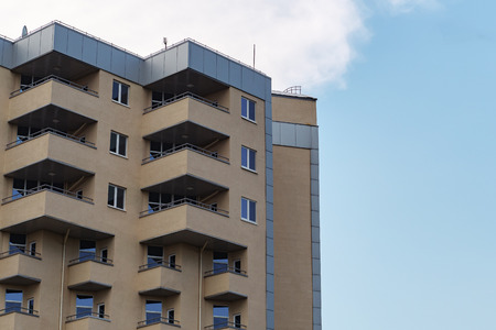 Modern residential apartment building with balconies on housing estate. Real estate market