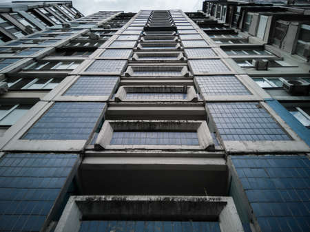 Bottom-up view of an old residential multi-storey prefabricated concrete house in the style of modernism in Eastern Europe with blue ceramic tiles.