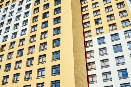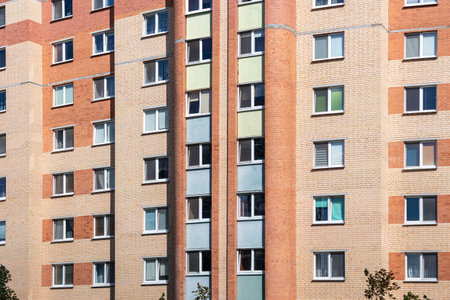 Facade of a multi-storey panel building. Fragment of wall of house. Typical block of flats in Russia