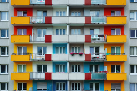 A vibrant, multicolored apartment building with numerous balconies stands tall in a bustling urban environment, An apartment complex in the city with colorful, symmetrical balconies, AI Generated