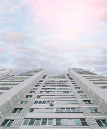 High-rise residential gray building with windows on a background of pink and blue sky. Bottom view