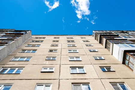 poor looking suburban block of soviet flats against a blue sky