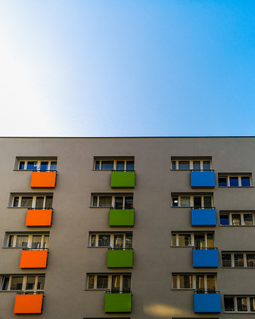 Looking up to facade of modern block of flat with dark balcony with colorful fronts