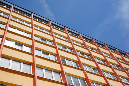 Residential building in yellow colors against blue sky