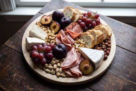 Antipasto plate with prosciutto crudo or jamon, dried apricots, olives and grapes