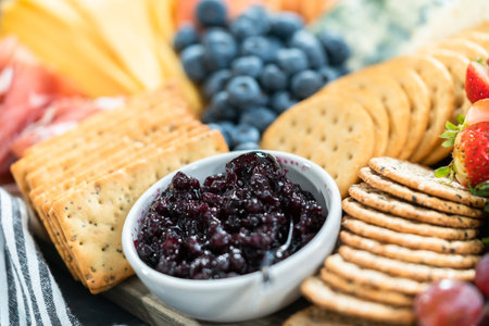 Arranging gourmet cheese, crakers, and fruits on a board for a large cheese board.