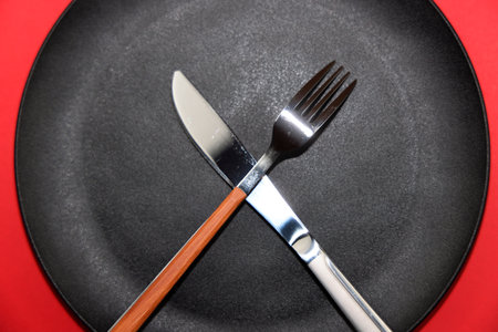 Empty plate, fork and knife. Black kitchen utensils set on stone table. fork and knife. Black kitchen utensils placed on a black table. Top view flat surface with space to copy