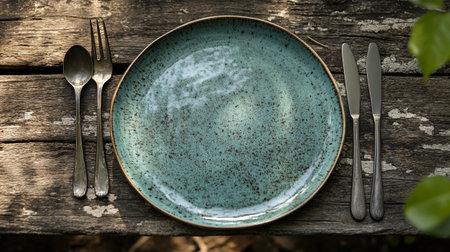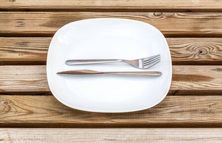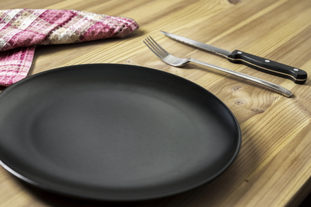 Empty plate, napkin, knife and fork on an aged pine wood table. Background with copy space
