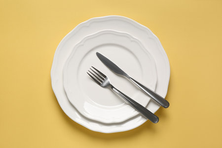 Clean plates with shiny silver cutlery on yellow background, flat lay