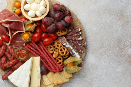 Charcuterie board with tasty appetizers on gray table, top view. Space for text