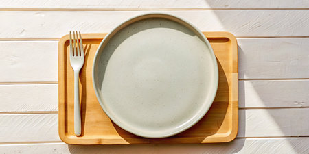 Empty steel metal plate with a fork. Kitchen utensils on grey marble table. Top view flat lay.