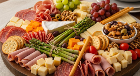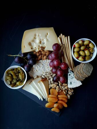 Big cheese board with appetizer assortment. Grape, cheese, nuts, jam and bread.