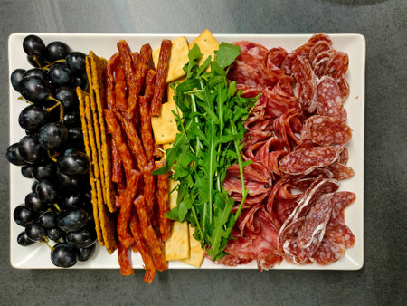 meat plate with sausages, arugula, grapes and chips for a buffet table