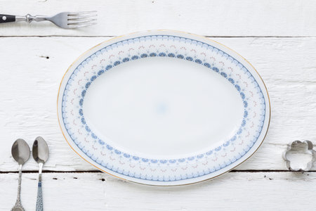 Top view of beautiful old dessert plate, fork, teaspoons and flower shape cookie cutter putting on white wooden table. retro and vintage style image