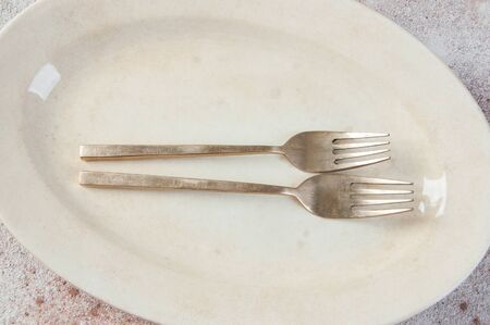 Old bronze forks on vintage dish on concrete background. Copy space for text, food photography props.