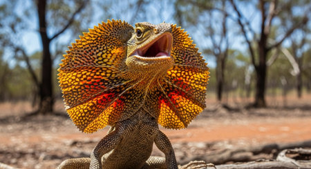 Soa Payung (Chlamydosaurus kingii), also known as the frilled lizard or frilled dragon, is showing a threatening expression.