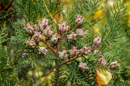 Chinese arvorvitae fruits. Cupressaceae evergreen conifer. The leaves are medicinal.