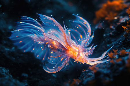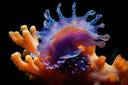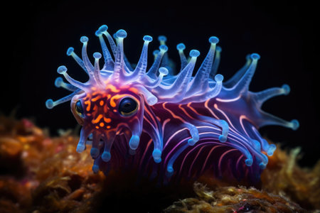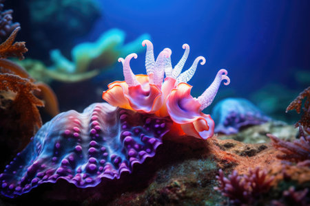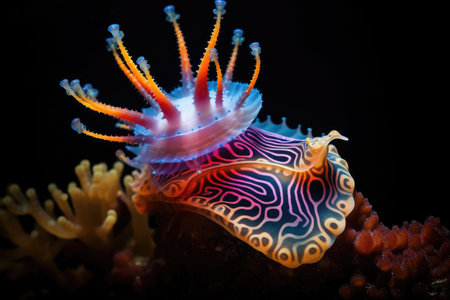 a vibrant nudibranch crawling on a coral reef, created with generative ai
