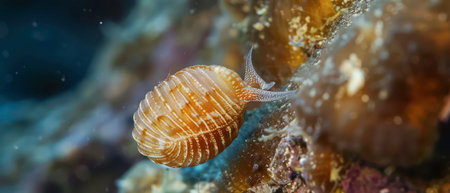 A close-up view of a striped sea snail crawling along a vibrant coral reef. The snail is bright orange and white, with a delicate, patterned shell. The water is clear and blue, and the coral is a rich, varied palette of colors.