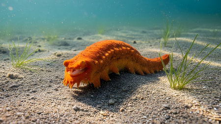 A bright orange sea cucumber crawls across the sandy ocean floor. The detailed close-up shows the texture of the marine invertebrate in its natural underwater habitat.