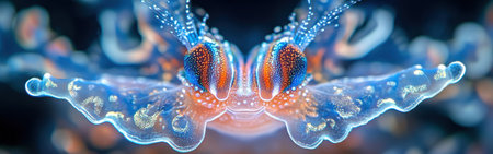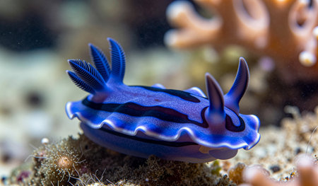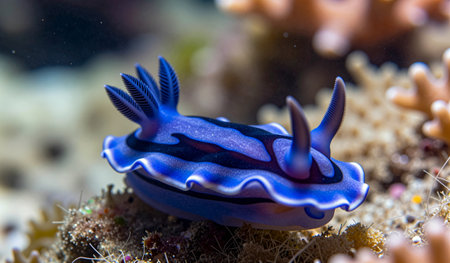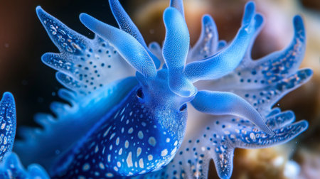 A stunning close-up of a vibrant blue nudibranch showcasing intricate patterns and textures. This exquisite marine creature inhabits coral reefs, embodying the beauty of underwater biodiversity.