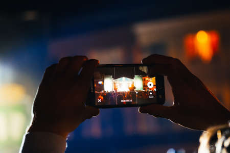 KINESHMA, RUSSIA - AUGUST 30, 2018: Hands with a mobile phone recording video at a night concert of rap musician Basta