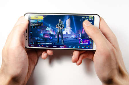 April, 2019. Kramatorsk, Ukraine. The gameplay of the game PUBG G Mobile on a white smartphone in hand