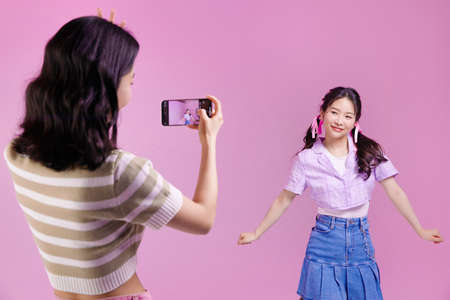 Pop culture attributes on a colored paper background. Gamepad, retro camera, headphones. 80s. Pop Art. Top view