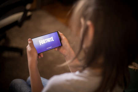 Bucharest, ROMANIA - May 10, 2021: Illustrative editorial concept image of a child playing Fortnite game on a mobile phone. Fortnite is a multiplayer Battle Royale shooter game by Epic Games.