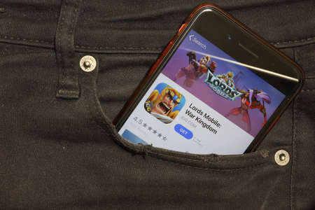 Saint-Petersburg, Russia - 6 December 2019: Mobile phone screen with Lords Mobile War Kingdom icon in pocket close-up, Illustrative Editorial.