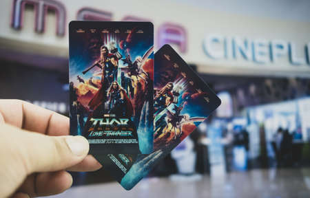 Samut Prakan, Thailand - June 23, 2022: Man hand holding Thor Love and Thunder collection card, a promotion from Major Cineplex. Major Cineplex ,It is the most popular cinema in Thailand.