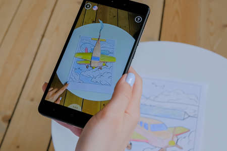 MOSCOW, RUSSIA - AUGUST 1, 2019. Woman holding page of coloring book and using smartphone with augmented reality application - virtual model of flying light aircraft. Future, AR, technology concept