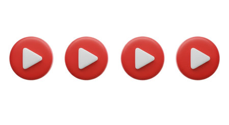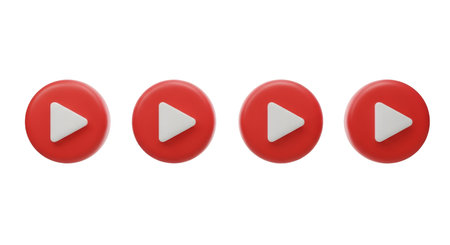 A row of four identical 3D rendered play buttons is presented against a black background. Each button is a vibrant red circle with a white, solid triangle pointing to the right, representing the universal play symbol. The buttons are evenly spaced.