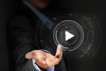 Businesswoman with media player button in palm
