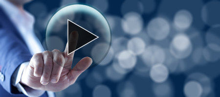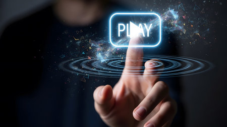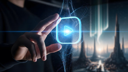 A finger touches a glowing blue play button surrounded by digital particles and concentric ripples.
