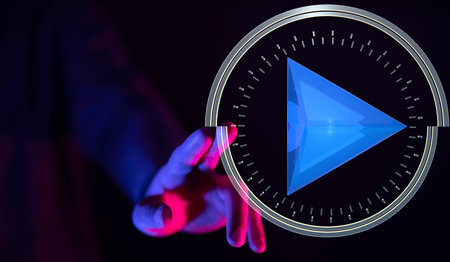 Finger about to press a play button on a home sound system interface. Black background and blue light. Composite between a photography and a 3D background. Horizontal image