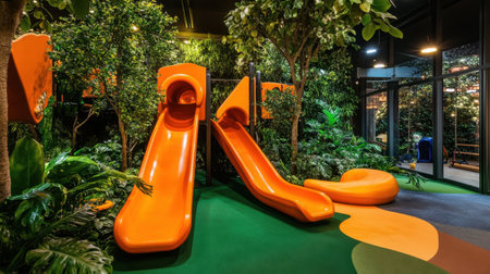 Vibrant playground with orange slides and greenery, kids' paradise in a nature-themed indoor play area bathed in light
