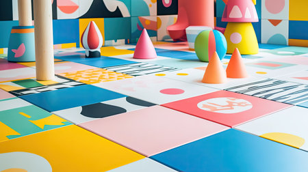An overhead view of a vibrant play area filled with colorful furniture providing an inviting and engaging space for children to play and explore, The top view of a geometric playground, AI Generated