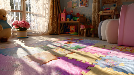 A cheerful playroom filled with colorful toys and soft mats, bathed in natural light. This strategic arrangement fosters creativity, imagination, and joyful exploration for children.