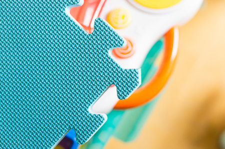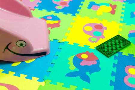 Childrens kindergarten toys resting on a brightly colored soft foam tiled floor