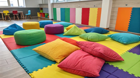 Plush floor cushions in vivid hues are tered across the foam surface offering comfy spots for kids to lounge read or gather for group activities in this lively environment..